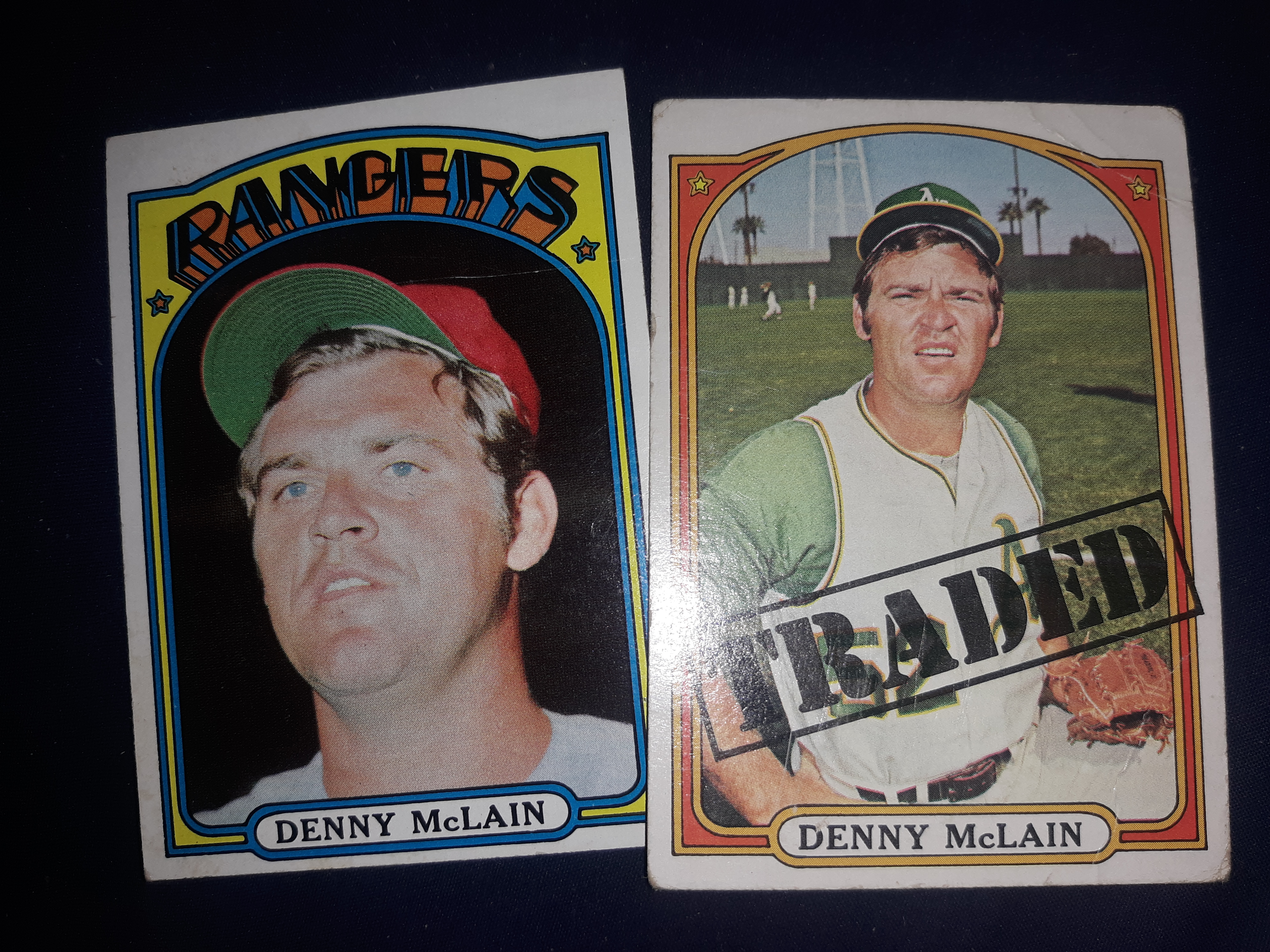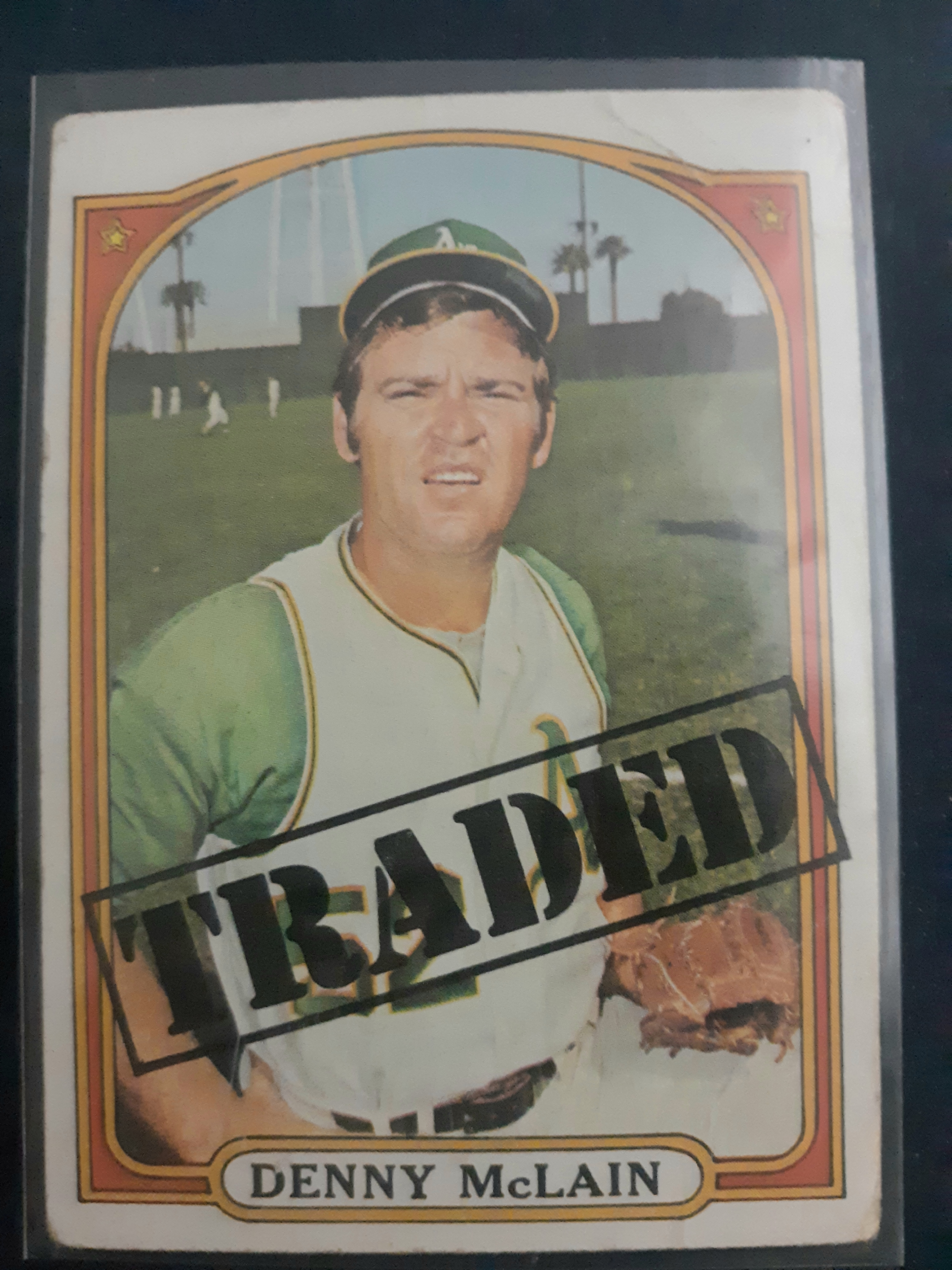 Baseball cards took a longer while to design and print in those days. The 1972 Topps checklist became committed at a certain time, and by that time the traded cards were included in it. McLain’s history with the Athletics was a very brief one. He only lasted 5 starts and was traded to the Braves on June 29, 1972 for future Hall of Famer Orlando Cepeda. When the McLain traded card came out, he actually was an Atlanta Braves player.