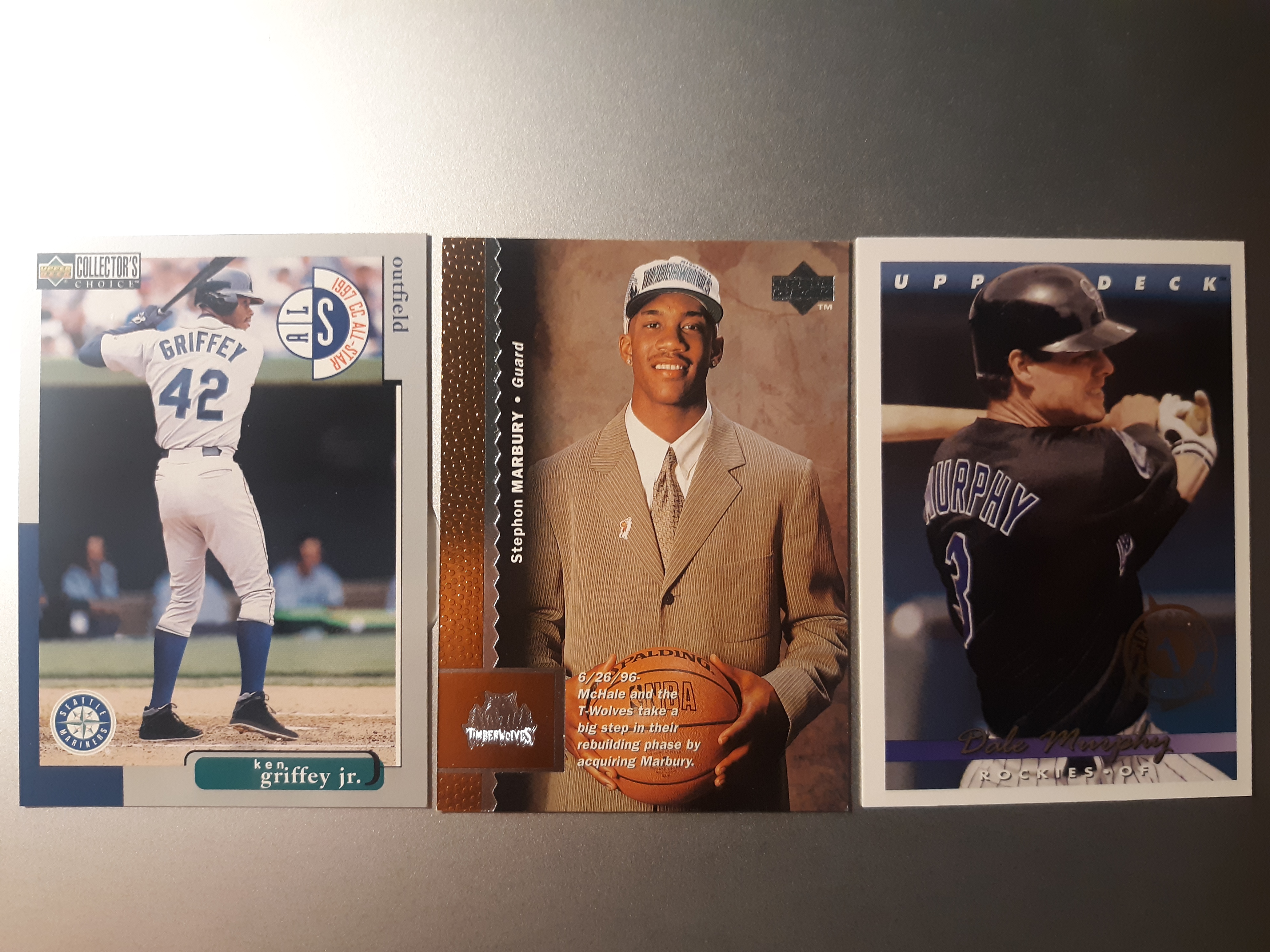 YES, you are looking at a basketball card in the middle. I RARELY buy non-baseball, but couldn’t pass up on the value, and the fact that I didn’t have a Stephon Marbury rookie card in my rarely-looked-at non-baseball box. Considering this was from 1996-97 Upper Deck, which became more of a premium set due to a Kobe Bryant rookie being in this set, I said what the heck.
