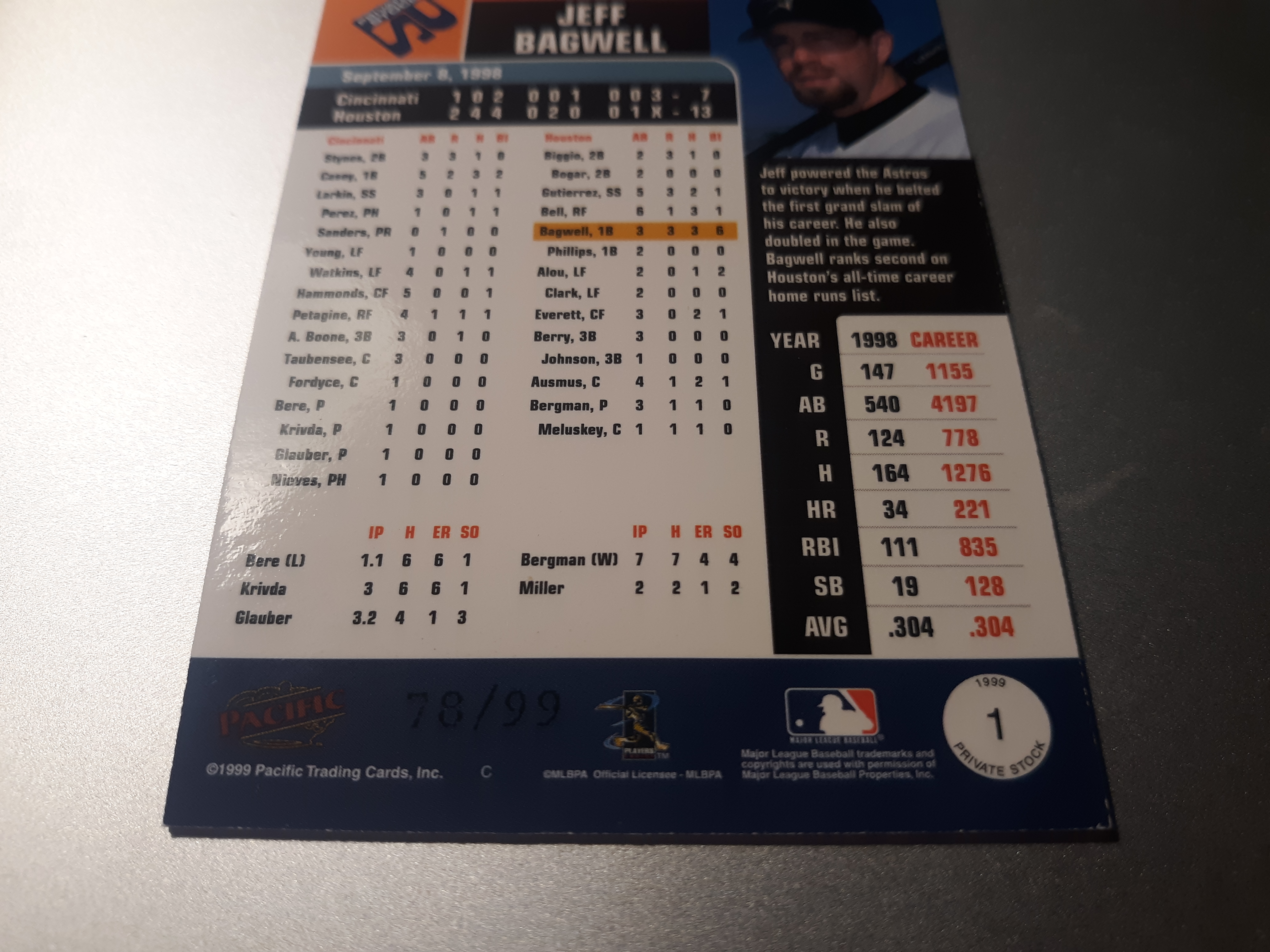Probably my most interesting dime box finds in years, this Bagwell is serialed to #99. It’s rare to find anything /100 in a dime box. It became my most expensive Bagwell card. The 76/99 is a little hard to see, but it’s at the bottom.