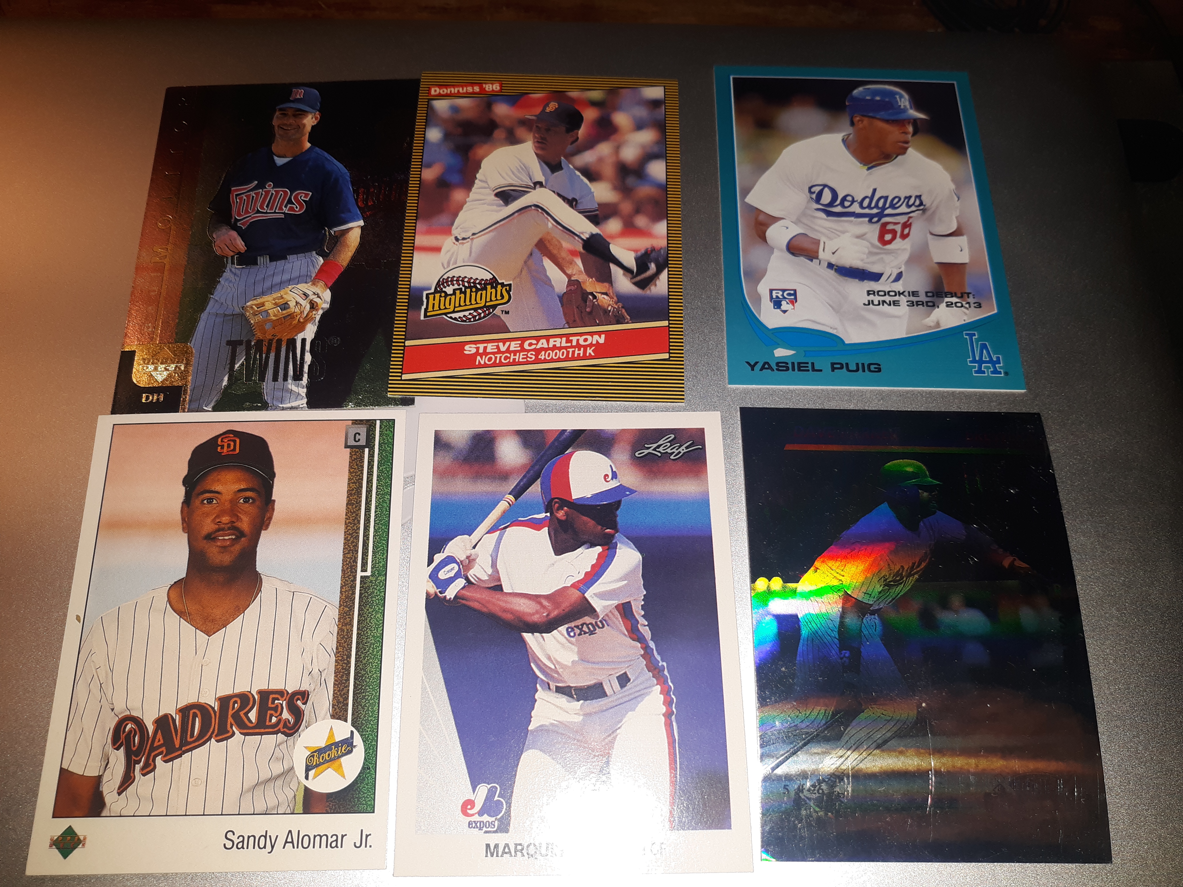 The Yasiel Puig “RC” from 2012 Topps Update actually is a subset, but a parallel one that counts in my book. The most expensive rookie cards of Sandy Alomar Jr. and Marquis Grissom now are in my collection. The Steve Carlton, a 1986 Donruss Highlights, is one of three cards published of him in a Giants uniform, the other two are the 1987 Topps box panel and a 1987 Woolworth’s. The Paul Molitor, a 1998 UD Special Edition, is a slight upgrade in value from the one Twins card I have of him. The hologram is a 1991 Denny’s Dave Parker of him as a Brewers player.