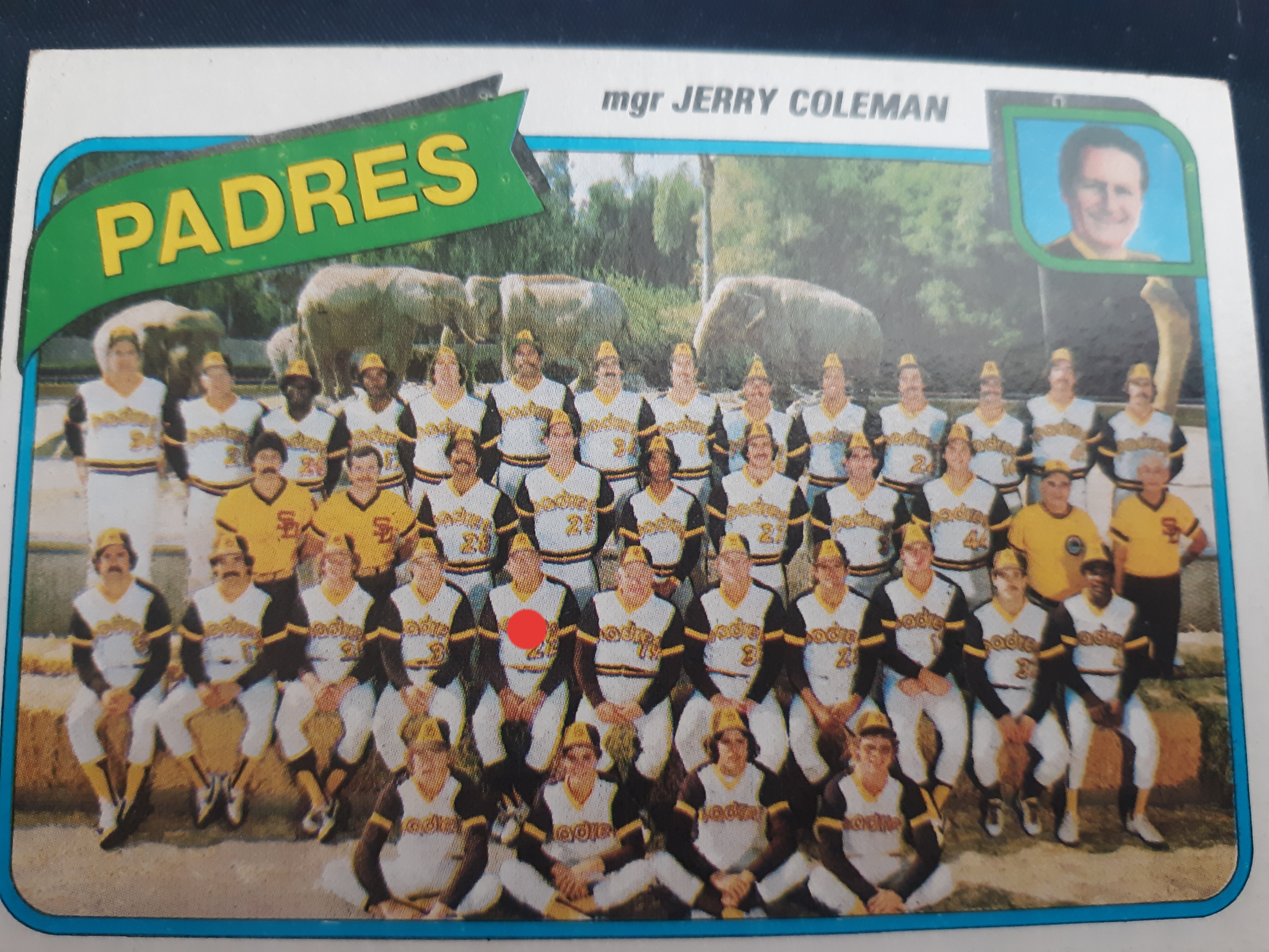 Hall of Famer Billy Herman was a coach for several teams in the 1950s through the 1970s, which I didn’t know about. I knew Herman was a Red Sox manager in the 1960s. Research led me to his tenure as Padres hitting coach in the late 1970s. I just so happened to have this 1980 Topps team card tucked away in a rump pile of Padres cards, and dug it out to look at it closer. The person with the red dot is Billy Herman.