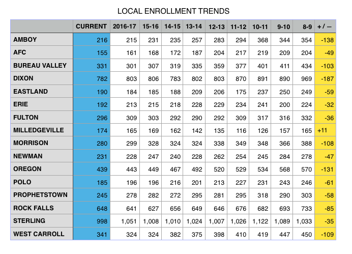 The Amboy figure is staggering at just more than 50% enrollment loss in 15 years. Lee County itself has taken a hit with almost 25% lost at Dixon and more than 30% lost at AFC, along with the closure of Paw Paw.