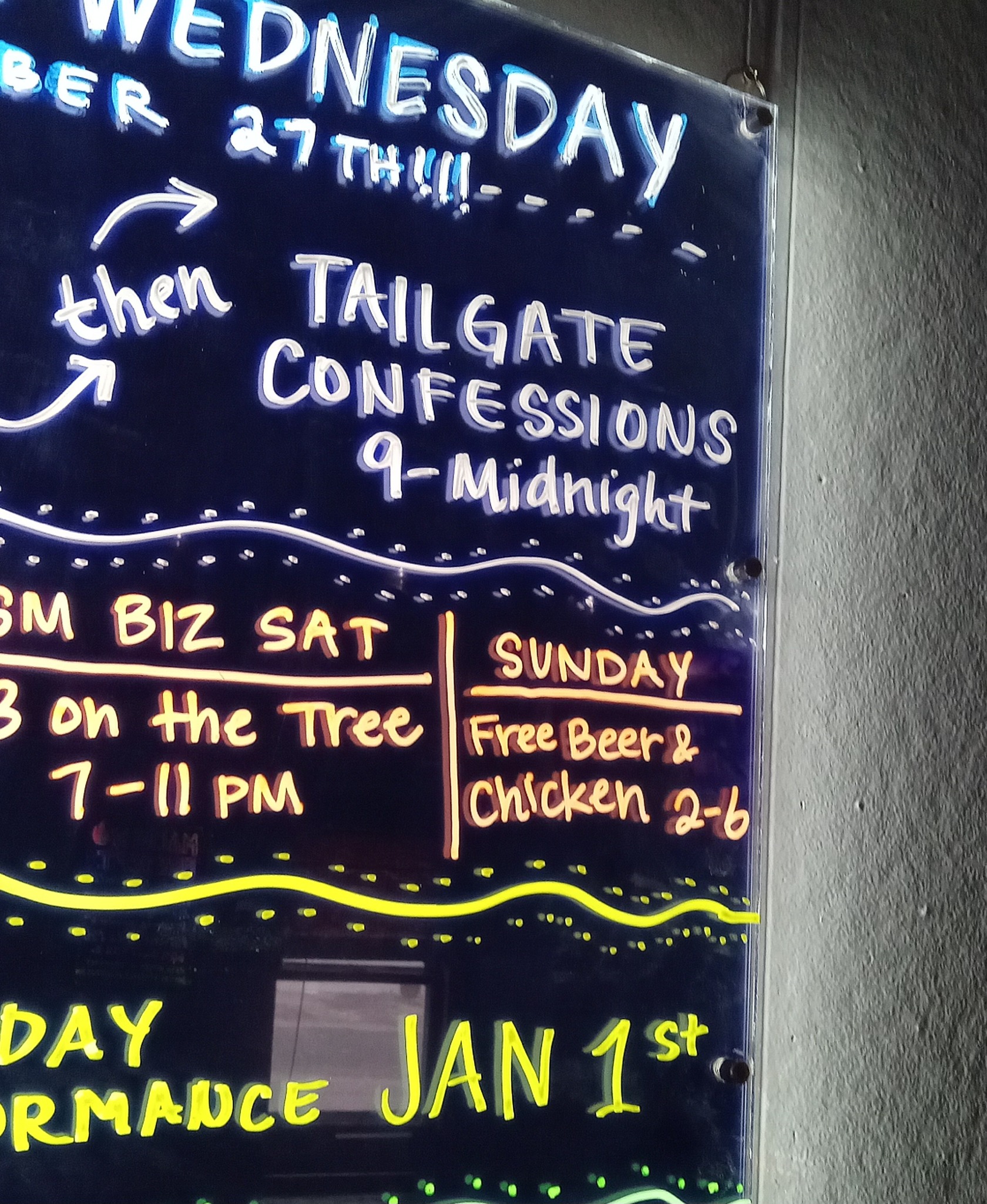 Another conversational topic involved the color changing marker board on one of the walls. I will admit: My mind wasn’t all that sharp while reading it (no, I do NOT drink on my trips!). So when I saw the phrases “Tailgate confessions” and “Free beer and chicken,” I had to ask.