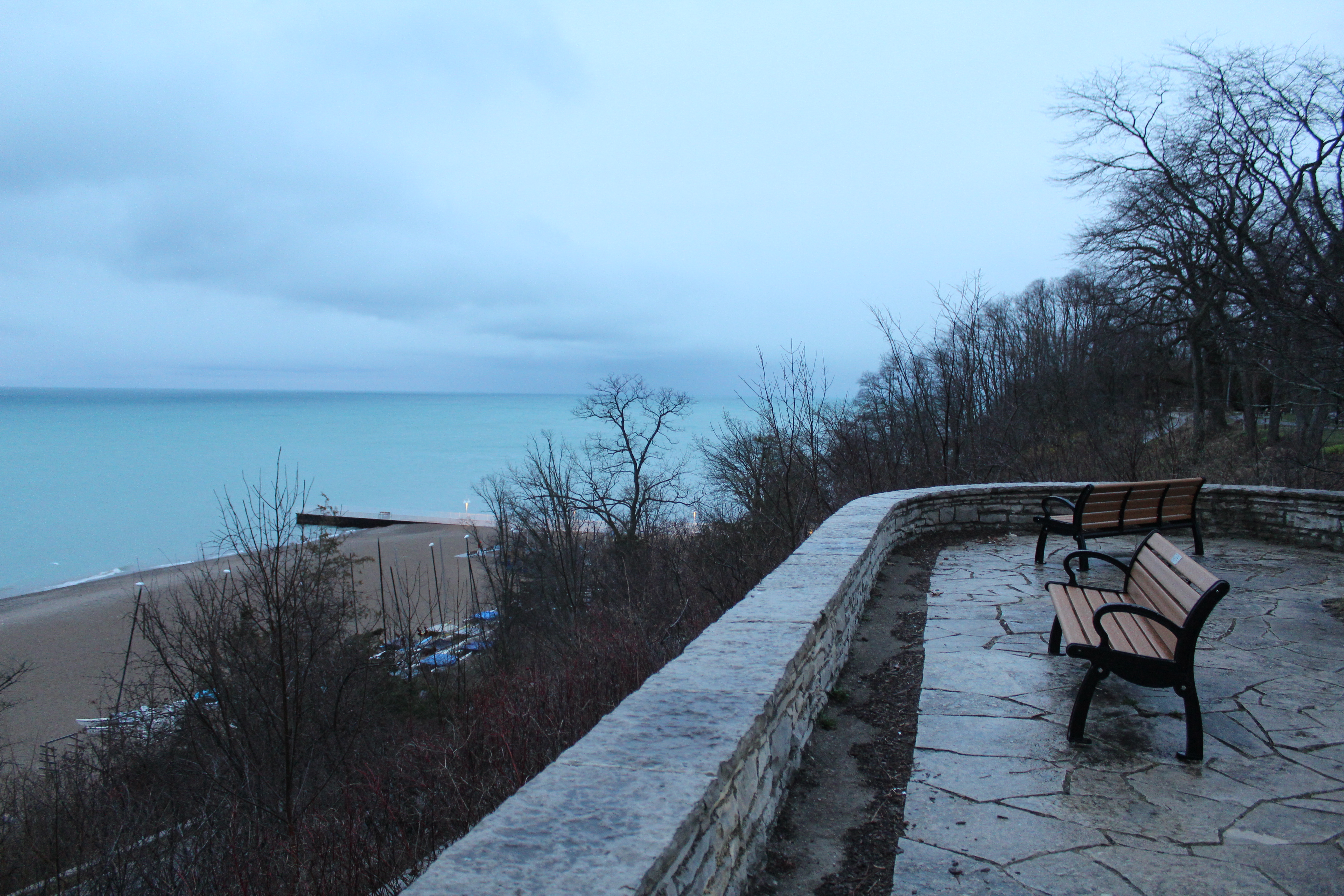 My first destination was Glencoe Beach and Lakefront Park. While I didn’t get the see the sunrise there, I thought it would be a great place to go to another time to see it. The lookout from the end of Park Avenue, which is situated along a bluff, provides a wide scope, with the sound of wind moving the trees and, of course, plenty of birds. Benches are there to take in the view. A walking path goes down hill and into a limestone shelter that also provides a lake view.