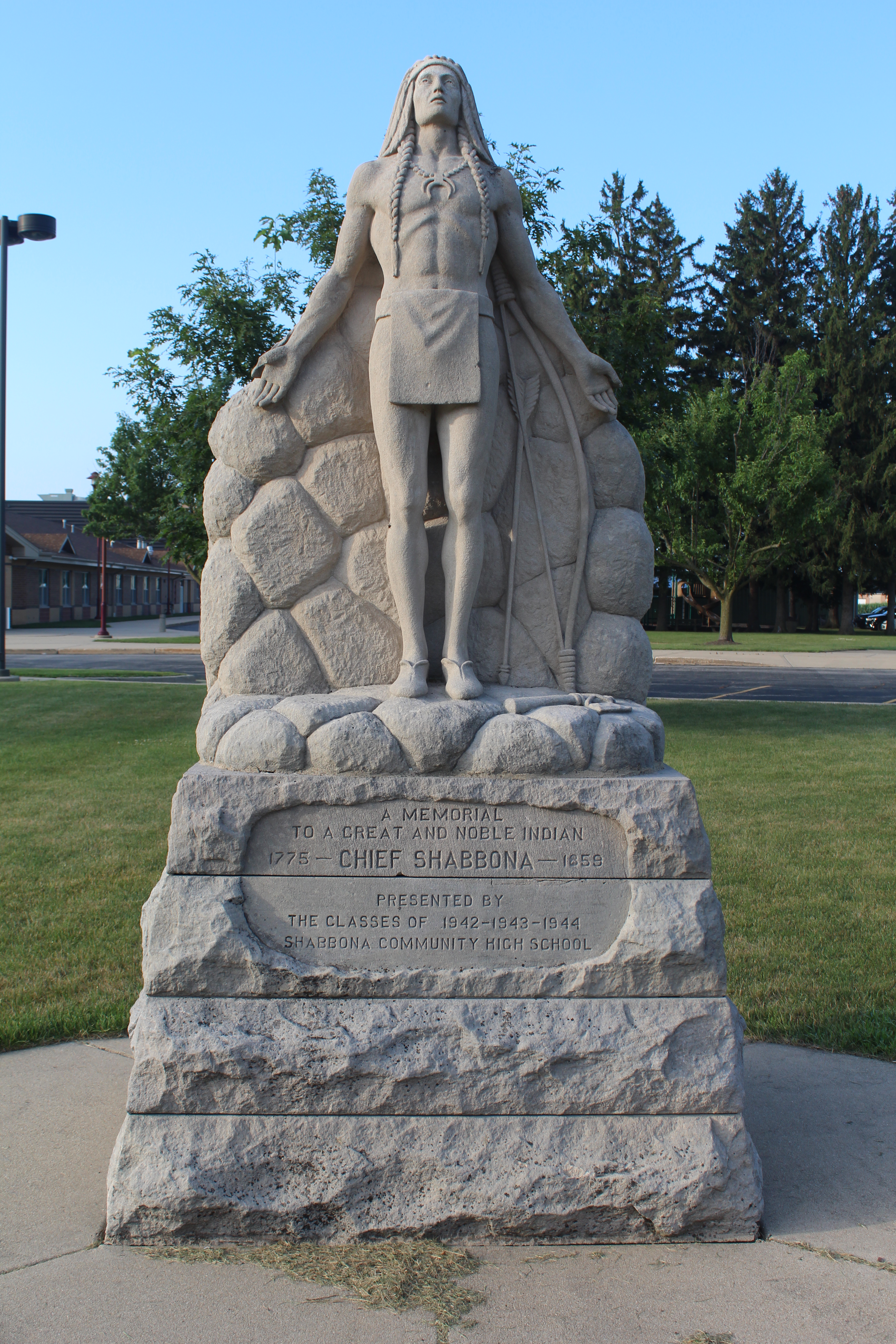 Shabbona, obviously, is named after the chief. The community has around 1,000 residents and shares its high school – Indian Creek High School – with nearby Waterman. The former Shabbona High School site in the early 20th century now is a greenspace near an elementary school at 301 W. Cherokee. A statue of Shabbona, erected by graduating classes of the former high school, stands in the middle of the greenspace. Of local interest, the Shabbona-Lee-Rollo Museum is located downtown.