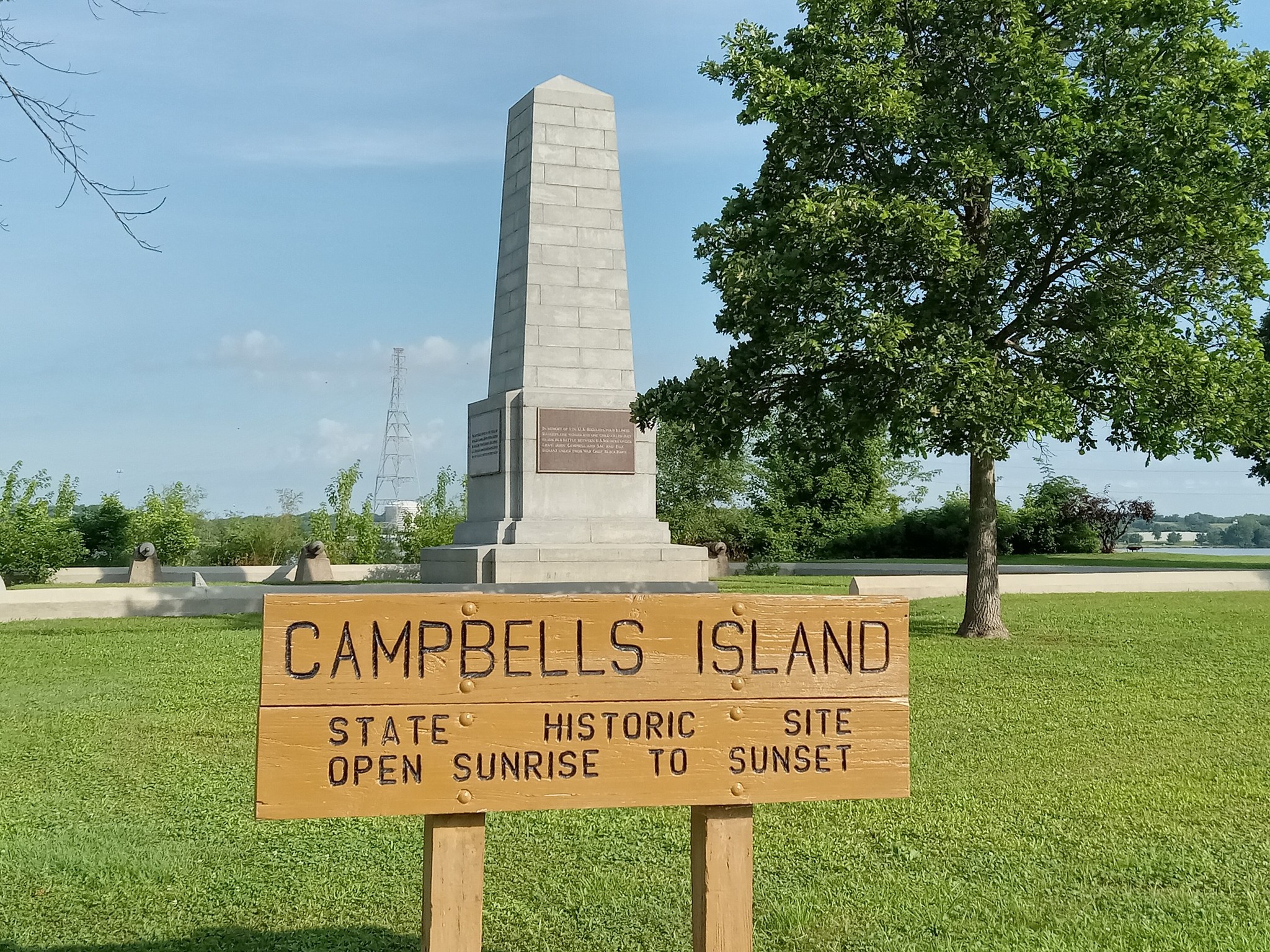 Located along the Illinois side of the Mississippi River, Campbell’s Island is accessible from state Route 84 between East Moline and Hampton. The bridge carries people and traffic to the island, where a loop street and a few side streets have houses on them – some on stilts to prepare for flooding. There’s a marina and a church on the island, but the centerpiece of the island is the large monument dedicated to the Battle of Rock Island Rapids.