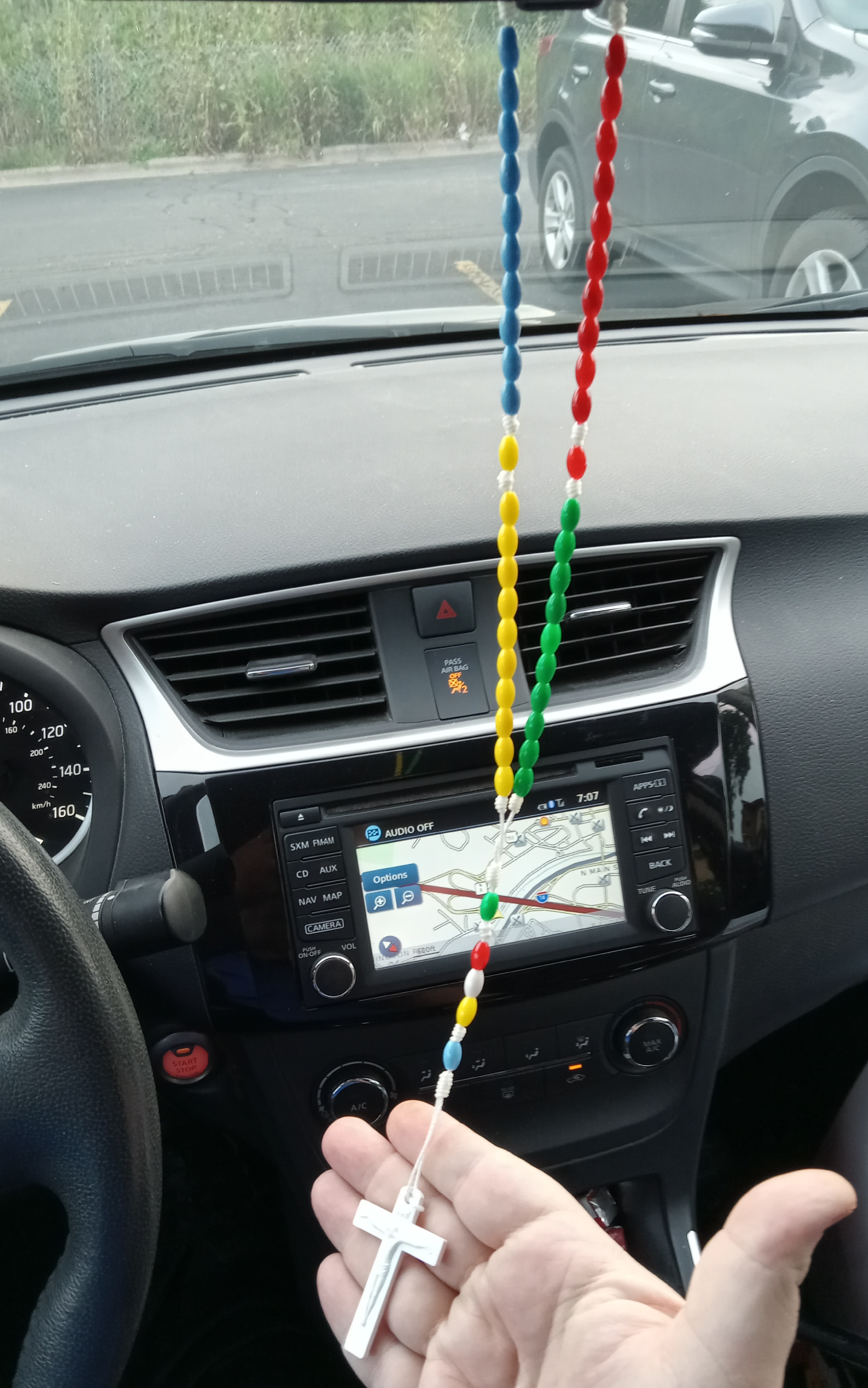 One of the souvenirs I bought from the museum is the Sheen Rosary. It hangs from my rearview window today.