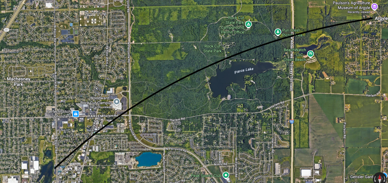 While the drawn line is not approximate in this map screenshot, it provides a general path of where the rail line went. Next to Woodward’s Rock Cut Campus is the word “HARLEM,” which is at the intersection of Harlem and Forest Hills. Pierce Lake at Rock Cut State Park actually sits on the right of way, and I’m told that there are still steel rails at the bottom of the lake.