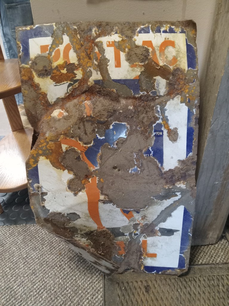 Continue to the end of Illinois Ave. and you’ll end at the Grundy County Historical Society, which has a museum. I visited here briefly to find out more information on the Pontiac Trail going through town. There are a couple of things: an old sign is there, damaged but legible, two old mileage signs whose writing looks like they were made from hammering small circles and painting them white (a lightbulb kind of look), and printed maps on where the trail went. I had the chance to talk with the society’s president, Kirk, about my trip and the intrigue on what would have happened if Route 66 had gone through Morris instead. Perhaps that old gas station on Southmor Road could have been a thing for much longer than what it was; and perhaps a Route 66 relic like Ambler’s Texaco.