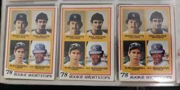 Another interesting cameo is Ryne Sandberg on the 1983 Topps Reggie Smith card. Sandberg’s rookie card is in that set. Smith was a good player throughout his career, with more than 300 homers, and this was his last original card. Sandberg is seen returning to first base on a pickoff attempt. Normally, the value of the card without Sandberg is $0.30, but with the interesting Sandberg cameo the value spikes up to “unlisted star status” at $1.25, according to Beckett.